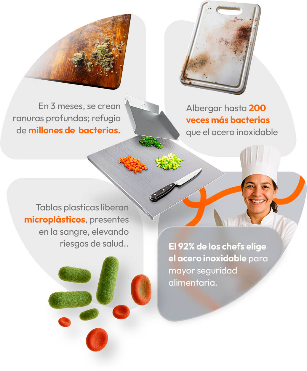 Las tablas de cortar tradicionales, especialmente las de plástico y madera, pueden albergar bacterias peligrosas y desprender microplásticos que terminan en tus alimentos.